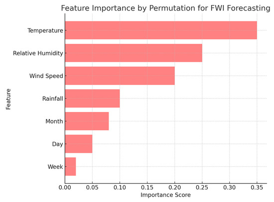 In terms of the model’s explainability, this study utilized the permutation approach to explore the importance of features. Among the features, temperature was the most influential variable. Its dominance stems from its direct impact on fuel dryness and flammability. Elevated temperatures accelerate moisture evaporation from vegetation and soil, creating conditions conducive to wildfire ignition and propagation. This variable’s strong influence underscores the critical role of thermal dynamics in fire weather prediction [59]. RH, on the other hand, ranked second among the covariates. It affects the moisture content within live and dead vegetation, a critical determinant of fuel availability for combustion. Low humidity levels increase the propensity for fire ignition and intensification, highlighting its relevance in accurately predicting the FWI under varying atmospheric conditions [60]. Following RH, WS was the third most influential factor. Its significance lies in its dual role in facilitating fire spread and supplying oxygen to flames. Higher wind speeds enhance the rate of fire spread, intensify burning, and complicate fire suppression efforts. This variable is integral to capturing the dynamic aspects of wildfire behavior in FWI forecasting [61]. Precipitation, contributing a lower importance score comparatively, provides information on short-term moisture replenishment. While precipitation can temporarily mitigate fire risk by wetting fuels and increasing soil moisture, its impact is often overshadowed by persistent dry spells that precede most wildfires. This variable remains relevant for capturing episodic reductions in fire risk [61]. Temporal variables, such as month, day, and week, contribute contextual information. The month captures seasonal variations that significantly influence fire weather conditions, such as peak fire seasons in the summer. Day-specific features account for diurnal cycles in temperature and humidity, which can influence daily fire risk. Weekly trends offer a broader temporal perspective but lack the granularity required for detailed short-term forecasting.