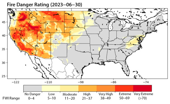 The integration of the forecasted FWI into fire danger rating systems provides a crucial implication of this study, underscoring its utility in real-world wildfire risk management. Using the forecasted FWI, a fire danger rating map was generated (Figure 12), categorizing the CONUS region into levels of fire risk: No Danger, Low, Moderate, High, Very High, Extreme, and Very Extreme. This spatial classification of fire danger allows for actionable insights, enabling stakeholders to identify areas at immediate risk and allocate resources effectively. For instance, the fire danger rating for 30 June 2023 illustrates the practical implications of FWI forecasting. This approach exemplifies how predictive modeling can transition into operational tools, bridging the gap between research and application.