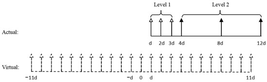 A two-level nested array ( and ; the maximum baseline is ) and its corresponding virtual baseline.