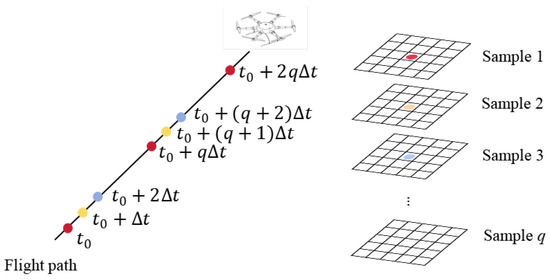 Due to the slow flight speed characteristics of UAVs, existing SAR equipment is often in the oversampling state, that is, the azimuth sampling frequency is far greater than the Doppler frequency . However, it has no contribution to the azimuth resolution of 2D SAR images. According to this feature, we proposed performing q-fold down-sampling on SAR data during 2D imaging to obtain q 2D SAR images with a sampling frequency of . Multiple observations were obtained to reduce the impact of system noise and provide data for a multi-snapshot imaging algorithm under the condition of not affecting the image resolution. The sampling process is shown in Figure 4. The sampling time of the original data was . After down-sampling, q sub-data were obtained, which are represented by different colors and named sample 1∼sample q. The sampling time for each set of sub-data was . When (13) was satisfied, the resolution of the 2D SAR images generated by the sub-data was consistent with the images generated by all the data.