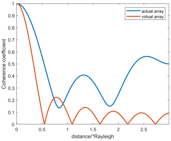 Figure 3 also shows the virtual baseline according to the nested array. The distribution of the virtual array is calculated based on the pairwise spacing between each element in the actual array. The generated virtual baseline is a uniform array from to . The longest interval equals , about twice the actual baseline. Naturally, the aperture of the virtual baseline array is larger, and the theoretical resolution is significantly improved to half the Rayleigh resolution. On the other side, the shortest interval of the virtual baseline is consistent with the actual baseline, which means that the maximum unambiguous resolution capability of the system is not affected.