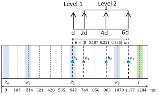 Figure 3 illustrates a two-level nested array, with and . The nested array uses antennas in total, and the maximum baseline is .