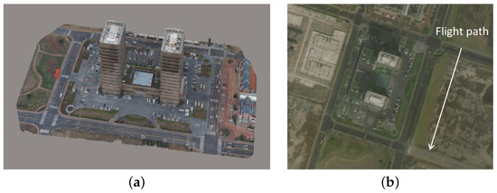 The survey area of the experiment. (a) A 3D model generated by optical oblique photography. (b) The flight path of the experiment.