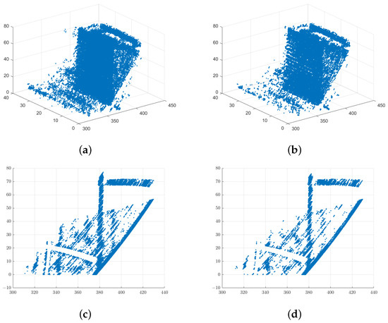 The 3D point clouds with artificial noise. (a) 3D point clouds from the OMP algorithm. (b) 3D point clouds from the proposed method. (c) The OMP algorithm’s results, viewed from the side of the building facade. (d) The proposed method’s results, viewed from the side of the building facade.