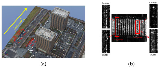 We took a building in the scene, as shown in Figure 14a. In order to make the results easier to understand, we classified the generated 3D point cloud into three surface structures: the ground, building, and roof. We projected the points of the different categories separately on the range–azimuth 2D plane, and three slices of the original 2D image corresponding to the three structures were obtained. Because the building scattering was far stronger than the ground scattering, whether the scene’s details of the ground were visible became an important index to evaluate the performance of the algorithm. Figure 14b shows the comparison of the results of the proposed multi-snapshot difference co-array algorithm and the BOMP algorithm.