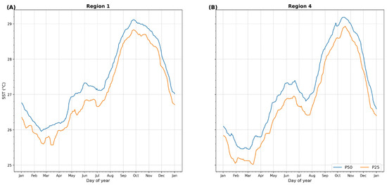 Twenty-two-year SST climatology (P50, blue) and 25th percentile (P25, orange) used for upwelling events threshold definition in Regions 1 (A) and 4 (B).