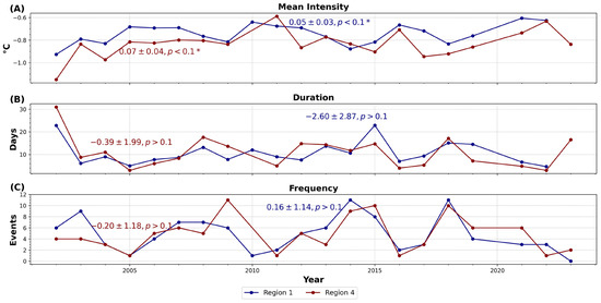 These metrics’ annual behavior shows that interannual variability modulates extreme upwelling events in both regions (Figure 8), changing intensity, duration, and number of events per year (frequency). In addition, mean metrics in Region 1 and 4 are not statistically different; however, interannual variations differ between them regardless of whether they are both in the southern Caribbean upwelling system (Table 2). Insignificant trends indicate that upwelling events did not change in the 22-year period assessed, except for their intensity, probably as a consequence of the Caribbean Sea warming [59]. Monthly averaged metrics indicate that extreme upwelling events are not very frequent (a non- or one event per month), lasting about 4 to 14 days and forcing a temperature reduction of −0.6 to −1.0 °C (Figure 9). In addition, the seasonality of these extremes does not seem to be coupled with the upwelling regional seasonality (Figure 7).