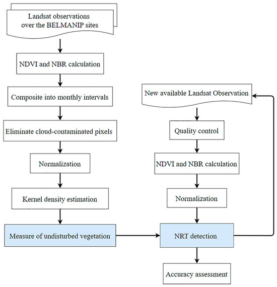 The nonparametric kernel density estimation theory was firstly employed in the field of vegetation anomaly detection by Estay et al. [34]. It was integrated into the R package ‘npphen’, which has been examined in insect outbreak cases [35,36] and drought evaluation of a wildfire event [37]. This method is appropriate for both NRT and retrospective detection. For each pixel in the study area, the ‘npphen’ package allows for the estimation of the spectral frequency distribution within one undisturbed phenological annual cycle from its stable historical records. Then, anomalies can be determined according to the new observation’s position relative to this distribution. This method is free from the errors that arise from time series fitting due to a few outliers and missing data. Currently, the Anomaly Vegetation Change Detection (AVOCADO) algorithm [26] provides an enlightening idea of NRT continuous monitoring based on the ‘npphen’ package. Differentiating itself from ‘npphen’, the historical records in AVOCADO are derived from the neighboring pixels that share the same vegetation type as the study area. The AVOCADO attempts to estimate a unified phenological distribution for the entire study area in advance; therefore, there is no need to set aside and process the historical baseline for each pixel during the detection process, which significantly accelerates the detection process. The performance of the AVOCADO algorithm was evaluated in three tropical forest ecosystems with anomalies such as selective logging and shifting agriculture.