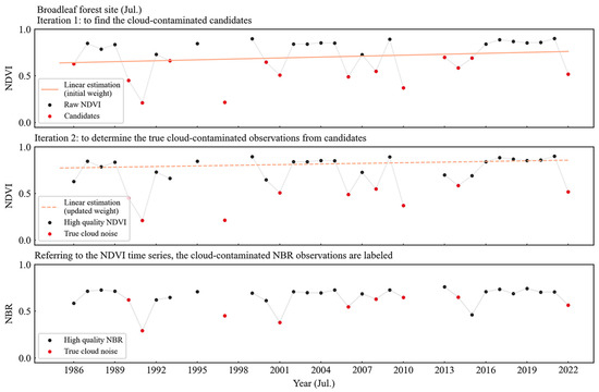 An example of detecting cloud-contaminated NDVI and NBR values in July from 1986 to 2022 at a broadleaf forest site. The highest possible cloud-contaminated NDVI and NBR values appear as abrupt drops in the time series, which can be determined after performing weighted linear fitting in two iterations.