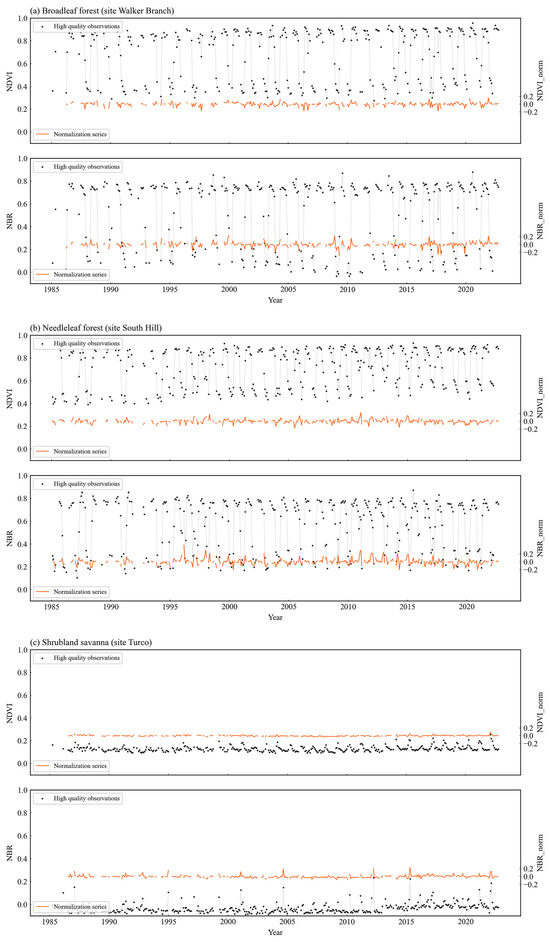 Time series of the NDVI and NBR values with high quality and their normalized NDVI and NBR values at the (a) Walker Branch, (b) South Hill, and (c) Turco sites. The biome types of these sites are broadleaf forest, needleleaf forest, and shrub, respectively.