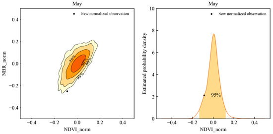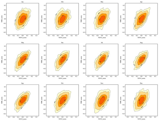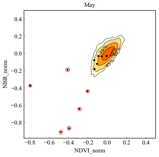 Regions within different probabilities describe different degrees of undisturbed vegetation state. In this study, we calculated several estimated density levels under the accumulated probabilities of 95%, 90%, 75%, and 50% for each month, which are shown as irregular circles in Figure 5. For each month, the distribution of undisturbed vegetation in the space of normalized NDVI and NBR values appears as an irregular inclined ellipse. From May to September, the distributions of normalized NDVI and NBR values are more compact in the short-axis direction, while, for the remaining months the distributions, they are relatively scattered, with larger areas and more irregular boundaries in regions corresponding to 95%, 90%, and 75% probabilities. It is necessary to make a monthly reference to the measure of undisturbed vegetation when detecting anomalies in near real time.