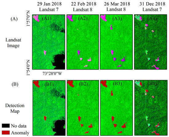 The anomaly detection maps for deforestation events in SA using UFVAD from high quality Landsat images. The first row ((A) A1–A4) is false-color composite (R: SWIR1; G: NIR; B: Red). The second row ((B) B1–B4) is the corresponding vegetation anomaly detected by UFVAD using the false-color composite as base maps. The legend ‘No data’ represents masked atmospheric noise pixels or masked non-vegetation pixels.