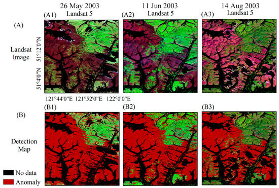 Figure 8 shows the anomaly maps for a fire event detected by UFVAD from Landsat images in SB. The Landsat image of 26 May 2003 is the first high-quality data acquired after the wildfire. In contrast to the clear-cutting in SA, the severely burned area appears dark red on the false-color image (Figure 8(A1)). The forest tree slash is evident in the NIR and SWIR bands, which can be captured by the NBR index. The fire event is distributed in the oblique lower half of SB, occupying more than 50% of the whole area. The anomaly map detected by UFVAD is generally consistent with the burned area (Figure 8(B1)). Surrounding the forest tree slash, some canopies were not completely disturbed (shown as dark gray-green on Figure 8(A1)), where moisture stress may be more evident relative to the greenness loss. This phenomenon was also detected as an anomaly by UFVAD. According to Figure 8(A2,A3,B2,B3), there was no further expansion or new occurrence of the fire event from 11 June to 14 August, but the canopies that were not completely burnt regrew to an undisturbed condition during the growing season, so they were no longer labeled as anomalous. However, there are also some detection noises in areas that are actually non-anomalous.