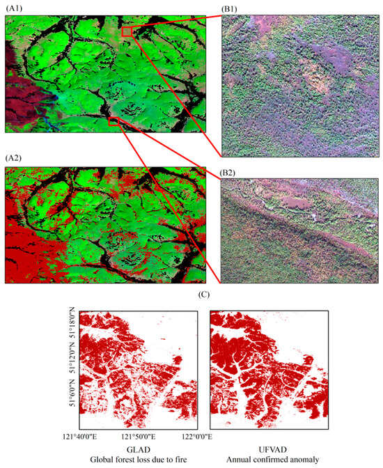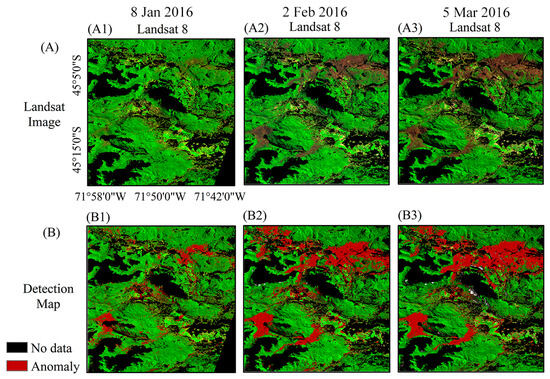 The anomaly detection maps by UFVAD from Landsat images for a fire event in SB. The first row ((A) A1–A3) is false-color composite (R: SWIR1; G: NIR; B: Red). The second row ((B) B1–B3) is the corresponding anomaly maps detected by UFVAD using the false-color composite as base maps. Non-vegetation pixels are masked according to the classification of a high-quality image during the historical period. The legend ‘No data’ represents masked atmospheric noise pixels or masked non-vegetation pixels.