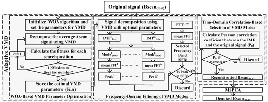 A denoising scheme for BHR data is proposed in this study, integrating adaptive VMD and MSPCA. The algorithmic foundations of this scheme are introduced in this section. Adaptive VMD incorporates WOA-based parameter optimization, frequency-domain filtering, and time-domain correlation-based mode selection. The optimization of the VMD parameters is initially conducted using the WOA, which improves the efficiency of VMD in extracting target signals. In the subsequent step, frequency bands and modes demonstrating a high degree of correlation with the original signal are chosen for reconstruction. MSPCA is then employed to suppress residual noise and to further diminish noise signals that resemble the target within the reconstructed Bscan. The detailed structure of the processing workflow is illustrated in Figure 1. Initially, BHR Bscan data, organized in M rows and N columns, are transformed into Ascan data of length N. This conversion simplifies the data processing required for the WOA optimization of the VMD parameters while preserving key data features. In this data compression method, denotes the value in the i-th row and j-th column of the BHR data, and is the mean value of the j-th column.