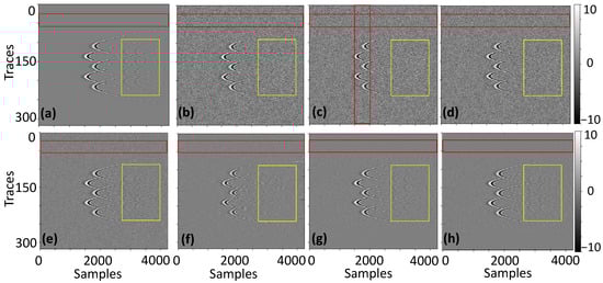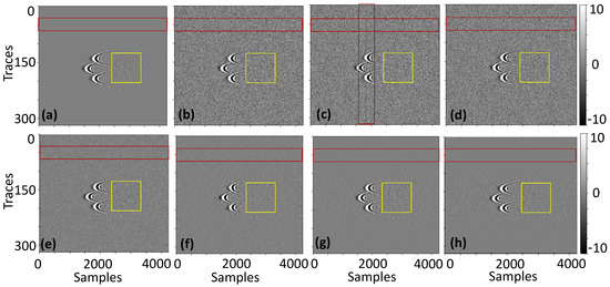 BHR-simulated Bscan data results. (a) Noise-free BHR-simulated Bscan data. (b) Noise-added Bscan data, −5.826 dB SNR. The denoised result for (c) RNMF-only, (d) RPCA-only, (e) MSPCA-only, (f) EMD-only, (g) the proposed adaptive VMD method, and (h) the proposed scheme (adaptive VMD + MSPCA).