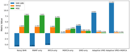 Figure 10 illustrates the performance of various denoising algorithms under different input SNRs, using three metrics, the output SNR, MSE, and RMSE, as demonstrated in Section 3.1.1 for Case 1. The input SNR is varied from −25 dB to 0 dB to simulate varying levels of noise interference, providing a comprehensive evaluation of the algorithms’ effectiveness. The methods evaluated include RNMF, RPCA, MSPCA, EMD, the proposed adaptive VMD method, and the combined adaptive VMD + MSPCA scheme. Figure 10a shows the output SNR as a function of the input SNR. As the input SNR increases, all algorithms exhibit improved performance. However, the adaptive VMD and adaptive VMD + MSPCA methods outperform the other methods across all SNR levels, especially under low-SNR conditions (−25 dB to −15 dB). The adaptive VMD method achieves significant SNR improvements by optimizing the modal components and suppressing the noise effectively. Furthermore, the adaptive VMD + MSPCA scheme enhances these gains, leveraging multiscale feature extraction and adaptive decomposition, with output SNR improvements exceeding 17.307 dB at 0 dB and up to 25.068 dB at lower SNR levels. Figure 10b presents the MSE results for the different input SNRs. Lower MSE values indicate better noise suppression and signal reconstruction. Among all methods, the adaptive VMD + MSPCA scheme consistently achieves the lowest MSE, significantly outperforming other methods, particularly at lower input SNRs. This superior performance is attributed to its integrated approach, combining adaptive frequency optimization and PCA to comprehensively reduce residual noise. Figure 10c shows the RMSE results, highlighting the robustness of the proposed methods in maintaining the signal’s integrity while suppressing noise. Again, the adaptive VMD + MSPCA scheme achieves the lowest RMSE, demonstrating its ability to retain critical signal features while minimizing distortion. In contrast, RNMF and RPCA show limited noise suppression capabilities, particularly under high-noise conditions, resulting in higher RMSE values. Overall, Figure 10 confirms the effectiveness of the adaptive VMD and adaptive VMD + MSPCA schemes in denoising BHR signals. As demonstrated in Section 3.1.1 for Case 1, adaptive VMD is particularly effective in handling nonstationary signals, while the combination of adaptive VMD and MSPCA provides the best overall performance. These results validate the superiority of the proposed methods in suppressing noise and enhancing the signal quality, confirming their suitability for geophysical applications involving noisy BHR data.