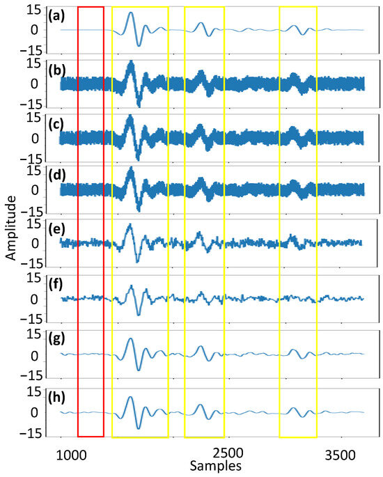Figure 12 is presented, illustrating the denoising performance of various algorithms under different noise conditions, with the target signal marked in yellow and the noise highlighted within the red boxes in Figure 12a. In the two leftmost vertical red noise boxes, the RNMF (Figure 12b) and RPCA (Figure 12c) methods fail to effectively suppress the noise, leaving significant residual noise signals. Although MSPCA (Figure 12d) achieves some noise suppression, residual noise persists. The EMD (Figure 12e) method reduces the noise but introduces high-frequency spike noise due to mode mixing, as explained in Section 3.1.1. In contrast, the adaptive VMD method (Figure 12f) significantly reduces the noise, leading to a marked improvement in signal clarity. The adaptive VMD + MSPCA scheme (Figure 12g) nearly eliminates the residual noise, providing the most effective suppression. In the middle vertical red noise boxes, the RNMF and RPCA methods again leave substantial residuals. While MSPCA (Figure 12d) provides moderate noise suppression, some residual noise remains. The EMD method (Figure 12e) reduces the noise effectively, and adaptive VMD (Figure 12f) achieves substantial noise suppression. Finally, the adaptive VMD + MSPCA scheme (Figure 12g) outperforms the other methods, nearly eliminating the noise and significantly enhancing the clarity and resolution of the target signal.