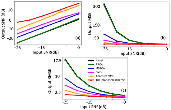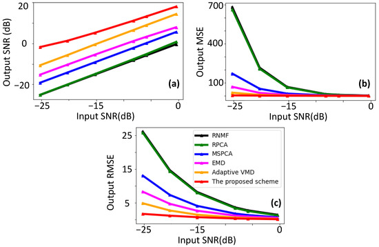 Output (a) SNR, (b) MSE, and (c) RMSE of the input noisy data with varied SNR.
