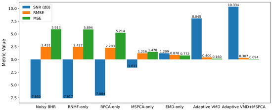 The initial SNR of the noisy Bscan data is −5.826 dB. After applying the various denoising methods, the following results are observed. RNMF: The SNR increases marginally to −5.816 dB, representing a slight improvement of 0.01 dB. This minimal improvement indicates RNMF’s limited capabilities in distinguishing between noise and signals. RPCA: As described in Section 3.1.1, RPCA achieves an SNR improvement to −5.184 dB (approximately 0.642 dB increase). However, RPCA is less effective in suppressing high levels of random noise, leading to suboptimal results for BHR signal processing. MSPCA: Through the integration of PCA and the WT, MSPCA achieves a notable SNR improvement to 0.180 dB (approximately 6.006 dB increase). However, as highlighted in Section 2.2, MSPCA is more effective for stationary signals, restricting its applicability to the inherently nonstationary and nonlinear BHR signals. EMD: EMD achieves an SNR of 3.290 dB, an improvement of approximately 9.116 dB. While this indicates reasonable noise suppression, mode mixing issues, as described in Section 3.1.1, introduce high-frequency spike noise, which limits its effectiveness. Adaptive VMD: Adaptive VMD tunes the frequency bandwidth of modal components, resulting in a substantial improvement in the SNR to 8.997 dB (an increase of approximately 14.823 dB). This demonstrates its effectiveness in suppressing noise and enhancing the signal clarity. Proposed Method (Adaptive VMD + MSPCA): The proposed method combines the strengths of adaptive VMD and MSPCA, resulting in an SNR improvement to 13.262 dB, corresponding to a substantial increase of approximately 19.088 dB. This significant enhancement not only suppresses noise but also enhances the visibility of weak signals, making it the most effective method for BHR signal processing. Additionally, its superior performance in terms of the RMSE and MSE metrics further validates the method’s robustness.