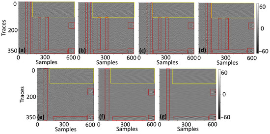 BHR experiment Bscan data results. (a) Bscan data processed through basic methods. The denoised result for (b) RNMF-only, (c) RPCA-only, (d) MSPCA-only, (e) EMD-only, (f) the proposed adaptive VMD method, and (g) the proposed scheme (adaptive VMD + MSPCA).