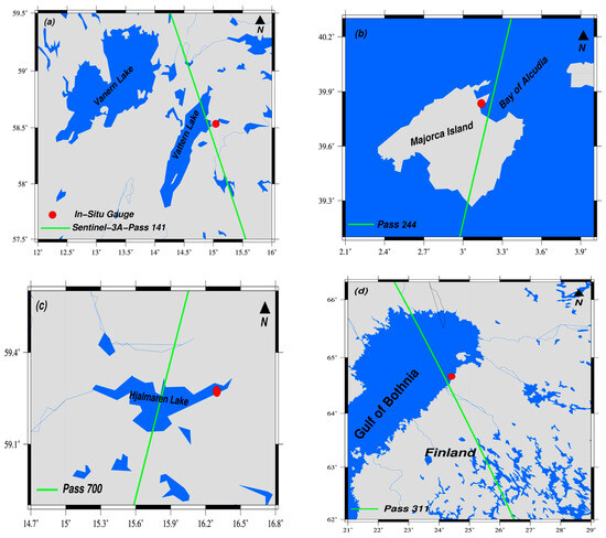 Sentinel-3A passes’ orientation and the locations of tide gauges in the study areas; (a) Vättern Lake, (b) the Bay of Alcudia, (c) Hjälmaren Lake, and (d) the Northeast Gulf of Bothnia.