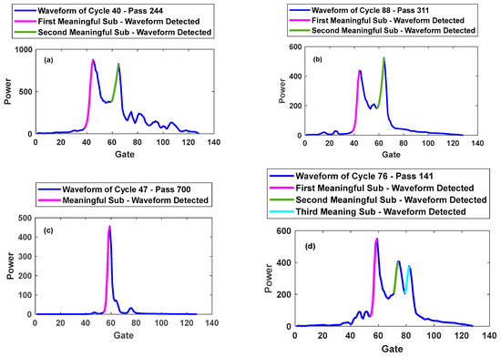Meaningful sub-waveform identification in the waveforms; (a) Cycle 40 of pass 244 in the Bay of Alcudia; (b) Cycle 88 of pass 311 in the Northeast Gulf of Bothnia; (c) Cycle 47 of pass 700 in Hjälmaren Lake; (d) Cycle 76 of pass 141 in Vättern Lake.