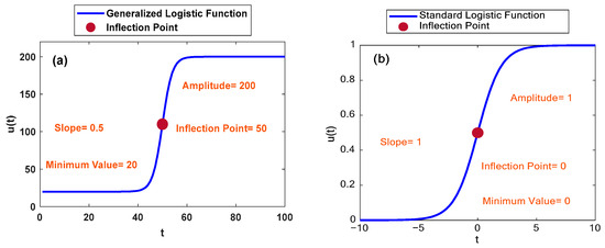 The generalized logistic function and logistic function; (a) the generalized logistic function for = 20, = 200, = 0.5, and = 50; (b) the logistic function for = 0, = 1, = 1, and = 0.