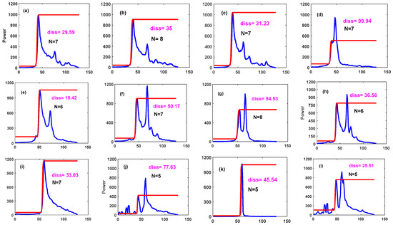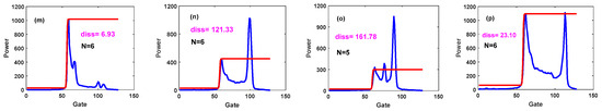 The dissimilarity parameter computed between the waveform (blue) and the GLF (red) in the first sub-waveform; (a–d) the examples for pass 244 for the Bay of Alcudia; (e–h) pass 311 for the Northeast Gulf of Bothnia; (i–l) pass 700 for Hjälmaren Lake; (m–p) pass 141 for Vättern Lake.