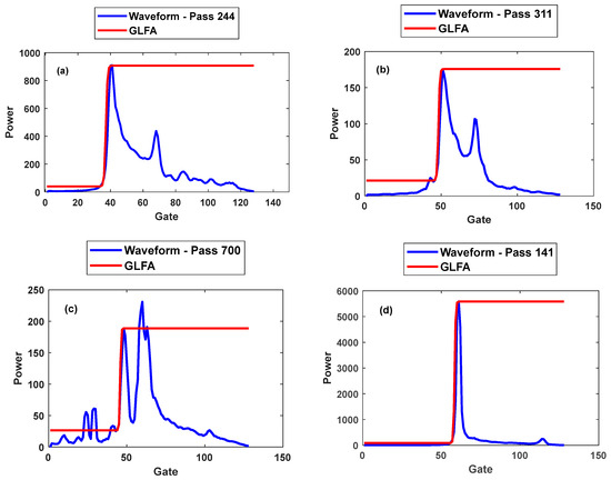 Fitted GLFA to the first sub-waveform in the study areas; (a) pass 244 for the Bay of Alcudia; (b) pass 311 for the Northeast Gulf of Bothnia; (c) pass 700 for Hjälmaren Lake; (d) pass 141 for Vättern Lake.