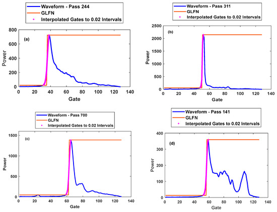 Fitted GLFN to the first sub-waveform in the study areas; (a) pass 244 for the Bay of Alcudia; (b) pass 311 for the Northeast Gulf of Bothnia; (c) pass 700 for Hjälmaren Lake; (d) pass 141 for Vättern Lake.