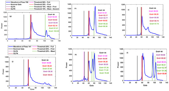 In Equation (12), is the number of interpolated gates in the first sub-waveform and is the number of waveforms. Figure 6 shows the fitted GLFN to the first sub-waveform for some of the waveforms from the study areas. The estimates of the GLFA (retracking gate and ascending slope) are influenced by the incomplete fitting of the function to the ascending part of the waveform, whereas in the GLFN, the ascending slope is computed from the waveform, and the retracking gate is obtained through a step-by-step evaluation of the ascending part. The performance of the GLFN approach depends on determining the slope of the ascending section, selecting the step size for the retracking gate assessment, and defining the evaluation parameter to identify the optimal retracking gate. In contrast, the GLFA approach estimates the retracking gate and the slope of the leading edge simultaneously.