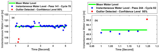 Outliers in the instantaneous water level time series for each pass in each cycle were identified and removed at a 95% confidence level (Figure 8).