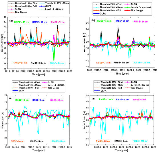 In Equation (12), and are the RMSEs obtained from comparing the time series of the GLFA and GLFN approaches and the optimum on-board retracker against tide gauge data, respectively.