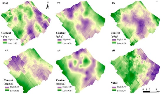 Logarithmic transformation was performed on each soil dataset to approximate normal distribution characteristics, followed by Kriging interpolation [45]. Different models were employed to interpolate various soil datasets. The results indicate that the average error (ME) for each soil parameter is close to 0, suggesting unbiased predictions with good accuracy. The root mean square standardized error (RMSSE) for each parameter is approximately 1, indicating that the prediction standard deviation is reasonably accurate. Additionally, the root mean square error (RMSE) of each soil nutrient is generally close to the average standard error (ASE), implying that the predicted values have minimal deviation from the measured values. This indicates that the interpolation results possess a certain level of precision (Table 2). The interpolation results are presented in Figure 3.