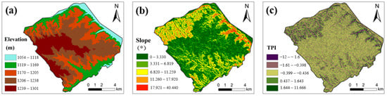 Spatial distribution of topographic data: (a) DEM, (b) slope, and (c) topographic position index (TPI).