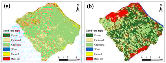In this study, the random forest supervised classification method [46] was employed on the Google Earth Engine (GEE) cloud platform to classify land cover. The classification system referenced was developed by the Ministry of Ecology and Environment for national ecological status investigation and assessment, which was adapted to the specific land use characteristics of the mining area. Consequently, land use types were categorized into farmland, forest land, grassland, water bodies, unused land, and construction land. In GEE, we loaded Landsat 5 images from 1989 to 1993 and Landsat 8 images from 2018 to 2022 for the training of land use classification models. First, GEE’s built-in functions were used to remove clouds and shadows. Sample points were then selected through manual visual interpretation and historical land use data of the mining area and subsequently divided into an 80% training set and a 20% validation set. A variety of features, including spectral bands, spectral indices, and texture features, were extracted from the remote sensing images to enhance classification accuracy. Next, a random forest classifier was constructed in GEE and trained using the feature variables. The resulting classification model based on Landsat 5 data achieved an overall accuracy of 91.29% and a Kappa coefficient of 0.8954, while the model based on Landsat 8 data achieved an overall accuracy of 91.87% and a Kappa coefficient of 0.9076, indicating consistently high classification performance. Finally, the two classification models were applied to generate land use classification maps for 1994 (Figure 6a) and 2023 (Figure 6b).