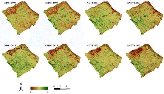 kNDVI has proved to be a better alternative indicator. kNDVI and NDVI are closely related (Equation (1) for NDVI, and (2)–(5) for kNDVI). Equation (5) is used to process the NDVI data obtained from GEE to generate a 25-year kNDVI data set of the Huojitu mining area from 1999 to 2023. To prove that kNDVI was more suitable than NDVI in this study, we compared them year by year.