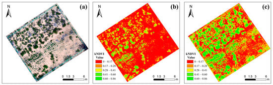 Remote sensing image data acquired in the study area: (a) RGB Orthophoto Map, (b) kNDVI, and (c) NDVI.