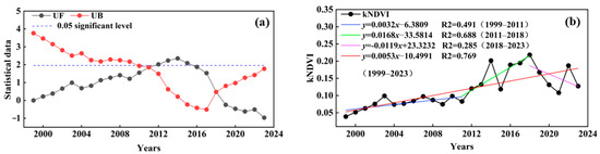 Time variation of kNDVI in the Huojitu mining area from 1999 to 2023: (a) MK mutation test, and (b) interannual variation.