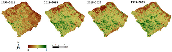 Figure 12 illustrates the spatial distribution of kNDVI across different time periods, revealing significant spatial heterogeneity in vegetation growth. Over the past 25 years, the average kNDVI value in the mining area has been 0.121, indicating generally poor vegetation conditions. Specifically, vegetation growth in the northwest, northeast, and southeast regions of the mining area has been notably poor. During the first stage (1999–2011), the overall vegetation growth was weak, with an average kNDVI of 0.063, particularly in the northwest, northeast, and eastern parts of the mining area. In the second stage (2011–2018), vegetation growth improved relative to the first stage, with an average kNDVI of 0.151; however, poor growth remained concentrated in the northwest and northeast. In the third stage (2018–2023), vegetation growth showed a trend similar to that of the second stage, with an average kNDVI of 0.173, but there was a slight decline compared to the previous period. Poor vegetation growth continued to be concentrated in the northwest, northeast, and southeast regions.