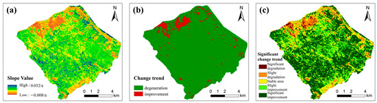 Using MATLAB [52] R2023a software, a linear regression trend analysis was conducted to examine the spatiotemporal evolution of vegetation growth in the Huojitu mining area from 1999 to 2023. The spatial distribution of the slope values is illustrated in Figure 13a. Based on these analyses and considering the vegetation growth conditions in the study area as well as the magnitude and sign of the vegetation growth trend slope θslope, the vegetation changes during this period were categorized into five grades (Table 5). Specifically, the largest area experienced significant improvement in vegetation growth, covering 64.23 km2 (57.35%). The smallest area showed significant degradation, amounting to 0.98 km2 (0.87%). Areas with slight improvement covered 31.12 km2 (27.79%), while those with slight degradation accounted for 5.47 km2 (4.88%). Finally, areas with no significant change in vegetation growth amounted to 12.20 km2 (11.11%).