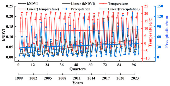 Precipitation and air temperature are important climate factors that determine the growth and distribution of vegetation. Based on meteorological data collected from 1999 to 2023, a Pearson correlation analysis [53] was conducted to examine the relationship between seasonal average precipitation, temperature, and kNDVI in the Huojituo mining area (Figure 14). The analysis shows that kNDVI exhibits similar seasonal patterns with seasonal average precipitation and temperature. Specifically, both precipitation and temperature reach their lowest levels in winter, increase in spring, peak in summer, and decrease in autumn. This pattern results in high correlations between kNDVI and seasonal average precipitation (r = 0.81, p < 0.01) as well as seasonal average temperature (r = 0.65, p < 0.01). From 1999 to 2023, both precipitation and kNDVI showed an upward trend (linear regression slopes of 0.0048 and 0.00071, respectively), while temperature remained relatively stable (linear regression slope of −0.0092). Additionally, kNDVI and summer average precipitation were significantly higher than those in spring (p < 0.01), but there was no significant difference in average temperature between these two seasons. Overall, the increasing trend in precipitation suggests that it is the most influential climatic factor for the peak value of kNDVI, playing a crucial role in vegetation growth in the Huojitu mining area.