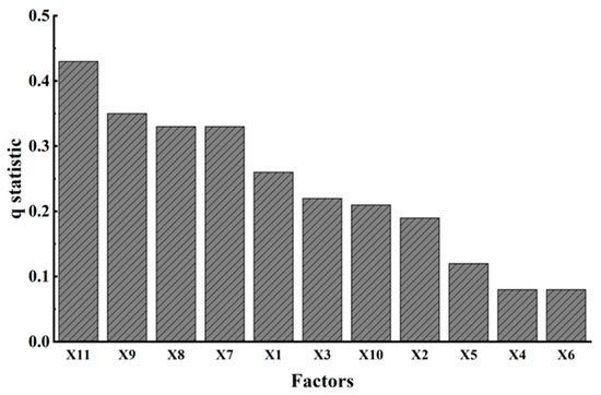 The geographical detector is primarily employed to analyze the spatial distribution differences of geographical elements and their influencing factors [50]. Its functions include factor detection, interaction detection, risk detection, and ecological detection. The factor detector assesses the spatial differentiation characteristics of dependent variables and the explanatory power of independent variables, which is essential for understanding the spatial differentiation of vegetation in mining areas. Therefore, kNDVI in the study area for 2023 was selected as the dependent variable, while 11 influencing factors were chosen as independent variables. Factor detectors were utilized to quantify the impact of these 11 factors on the spatial differentiation of vegetation dynamics (Table 3), with the q value used to measure the explanatory power of each factor. The formula is as follows: