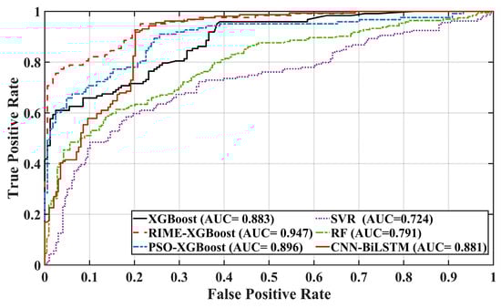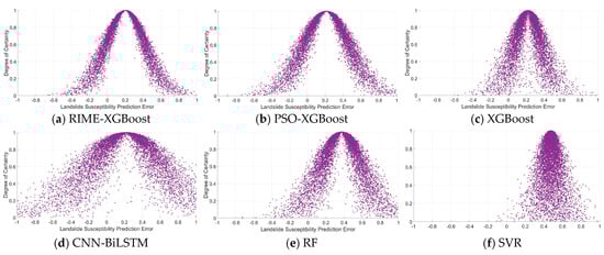 - The RIME-XGBoost-based landslide susceptibility model shows the smallest expectation and super-entropy, indicating the accuracy and stability of the RIME-XGBoost predictions. Additionally, the XGBoost model optimized by RIME outperforms the standard XGBoost model, with an AUC score of 0.947 and an increase of 0.064. Compared to other models, its accuracy improved by up to 0.15.