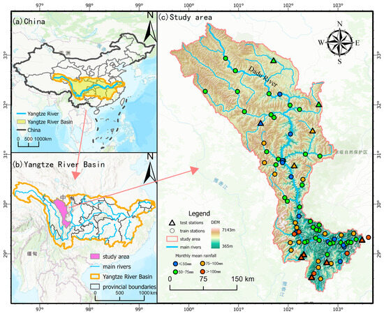 The Dadu River (DDR, Figure 1) originates from the southern foothills of the Guoluo Mountains in Qinghai Province and is the largest tributary of the Minjiang River [66]. The area of the DDR is approximately 77,400 km2 and has a slightly ‘L’-shaped configuration, with higher terrain in the northwest and lower terrain in the southeast [67]. The average annual precipitation across the DDR is approximately 800 mm, increasing from the northwest to the southeast of the basin [68]. The DDR is characterized by complex terrain and diverse landforms; therefore, it is significantly influenced by both the East Asian and South Asian monsoons. The upper DDR has a plateau mountain climate with relatively low annual precipitation and fewer days of heavy rainfall. In contrast, the middle and lower reaches experience a subtropical humid monsoon climate with higher annual precipitation and more days of intense rainfall in summer [69,70].