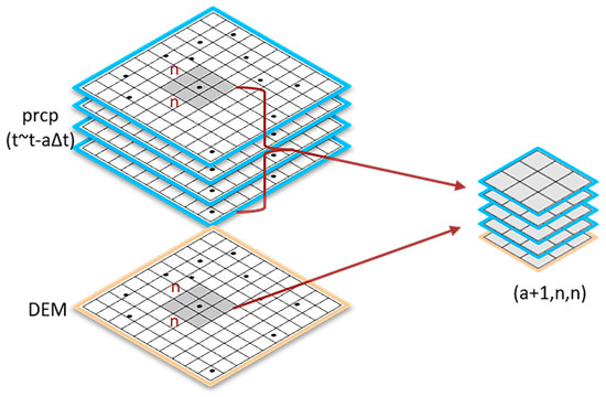 For ConvLSTM and D-ConvLSTM, the input data at time t are a matrix of size (a + 1, n, n), where a is a hyperparameter of the model used to set the time length for looking back at the precipitation, and n is also a hyperparameter used to set the range of terrain and precipitation extraction around the stations. The entire matrix consists of grid precipitation data and a DEM within the range of n × n from time t to t-a∆t, as shown in Figure 2.