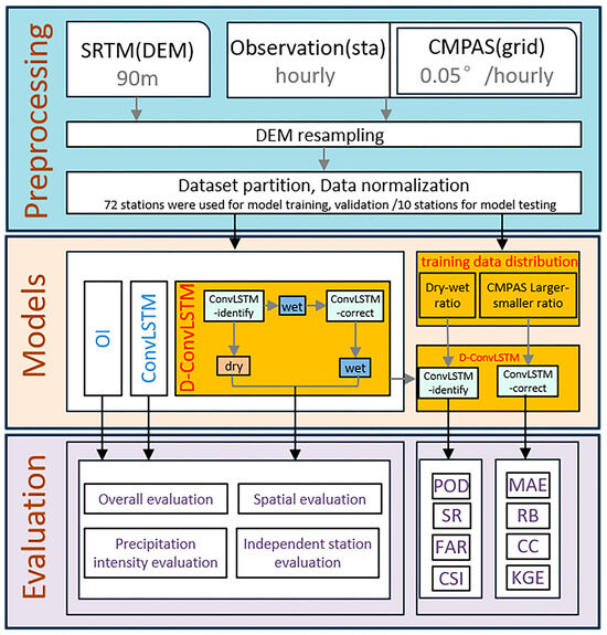 The flowchart of this study is presented in Figure 3. This study proposes the D-ConvLSTM model to integrate observed precipitation data from DDR stations with CMPAS gridded precipitation data, addressing both precipitation classification and value estimation errors. The performance of D-ConvLSTM is assessed using multiple evaluation metrics and compared against the results of the OI and ConvLSTM to demonstrate its overall improvement. Furthermore, the study examines the impact of different training data distributions on the D-ConvLSTM merging model by changing the ratio of dry to wet data in the training data and the proportion of overestimation or underestimation of gridded precipitation compared with station observations. Finally, classification and statistical indicators, including overall evaluation, independent station evaluation, precipitation intensity evaluation, spatial evaluation, and evaluation of D-ConvLSTM model performance with different training data distributions, are used to evaluate different types of merged precipitation.