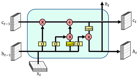 ConvLSTM is a deep learning model that integrates convolutional neural networks (CNNs) and long short-term memory (LSTM) networks. ConvLSTM considers both the temporal correlation of precipitation sequences and the spatial distribution characteristics of precipitation, making it particularly suitable for multisource precipitation data merging [51,52]. Its structure is similar to that of LSTM [75]. To reduce the complexity of the network structure, this paper adopts a simplified ConvLSTM, which has the same structure as LSTM but replaces the Hadamard product in LSTM with convolution operations from neural networks, as shown in Figure 4.