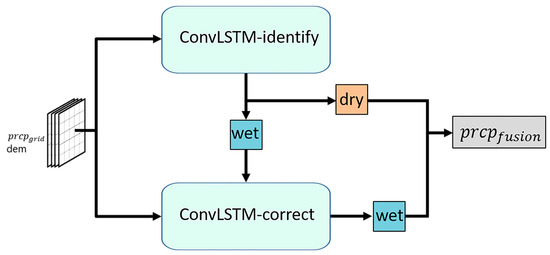 Internal structure of D-ConvLSTM. The grid precipitation and DEM are input into ConvLSTM-identify and ConvLSTM-correct. Wet and dry classification is carried out by ConvLSTM-identify, and the precipitation value at wet time is further corrected by ConvLSTM-correct.